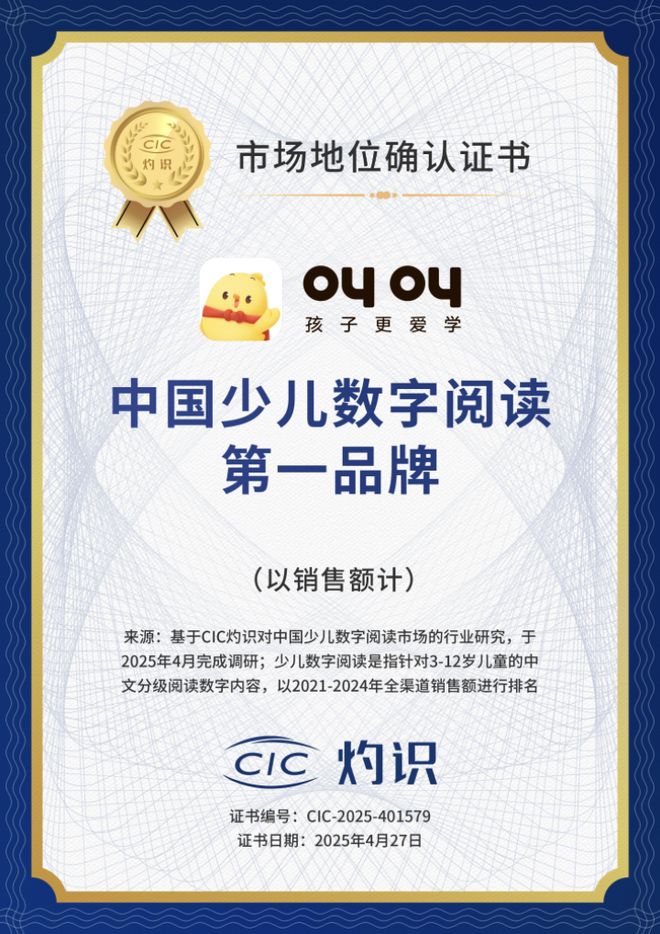 CIC 灼识咨询是中国信息协会市场研究业分会(CMRA)会员,作为第三方研究机构,基于丰富的行业洞察、可靠的数据支撑以及全面的行业调研,面向企业提供行业研究相关服务并出具市场地位确认证书,以认证相关企业在特定领域的市场地位。其基于对中国少儿数字阅读市场的行业研究,以 2021-2024 年全渠道销售额进行排名,最终认证叫叫为「中国少儿数字阅读第一品牌」及「连续四年中国少儿数字阅读第一品牌」。这意味着叫叫在用户规模、产品影响力、技术创新及用户满意度等度综合评估结果均受到行业肯定。